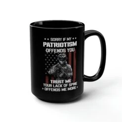 Introducing our American Soldier Patriotism Mug 15 oz, a bold and unapologetic statement of unwavering national pride. Displaying the powerful message, “SORRY IF MY PATRIOTISM OFFENDS YOU TRUST ME YOUR LACK OF SPINE OFFENDS ME MORE,” this mug is designed to evoke a deep sense of patriotism and strength.