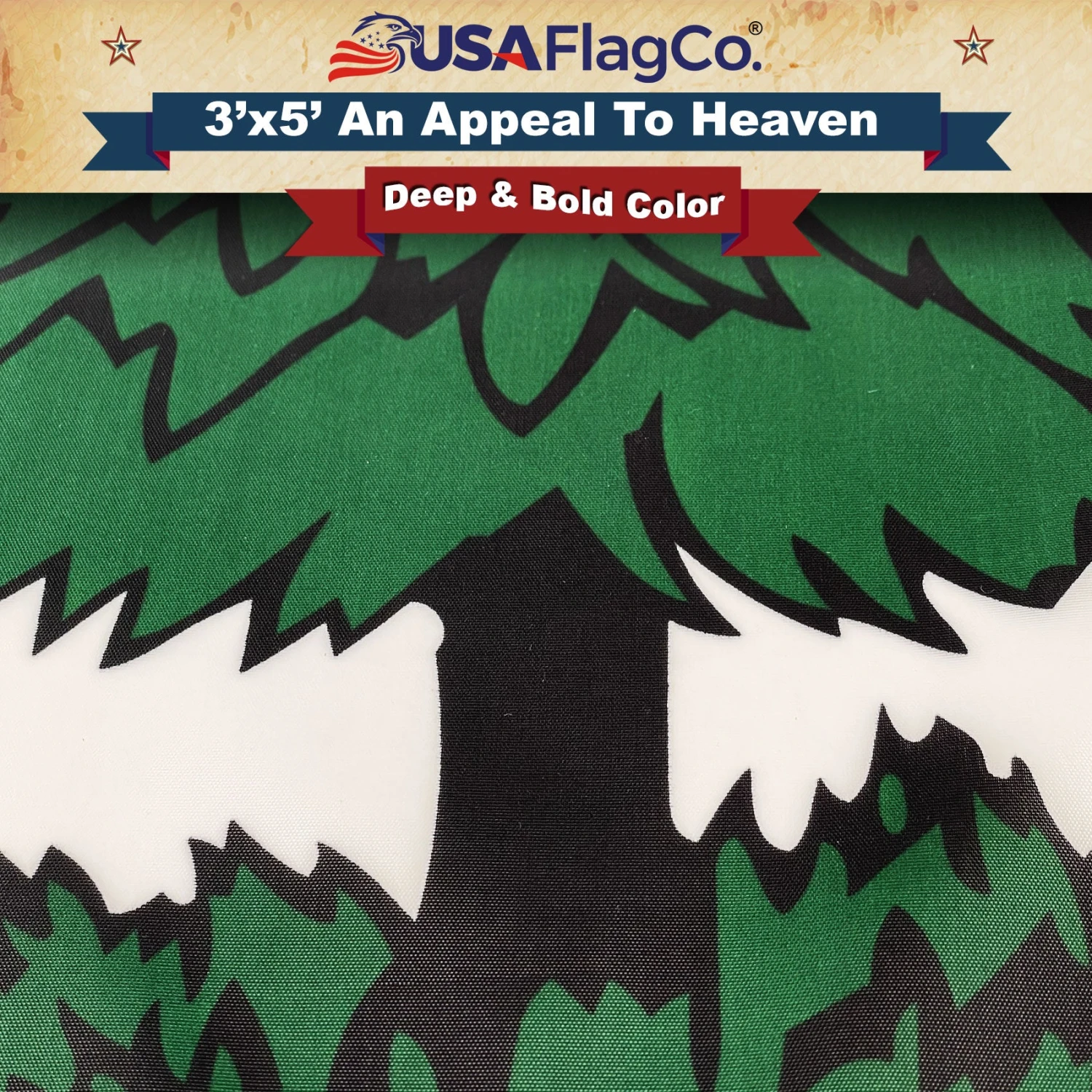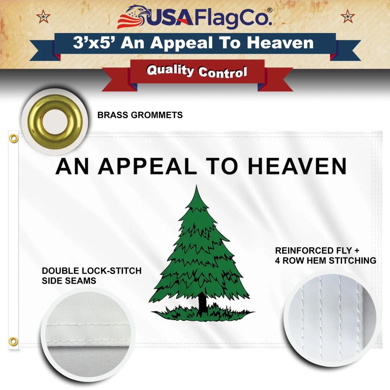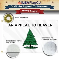 Eye-Catching Design: The flag features a unique and captivating design that catches the eye and draws attention. The “An Appeal To Heaven” phrase and the green pine tree on the white background make it stand out among other flags.