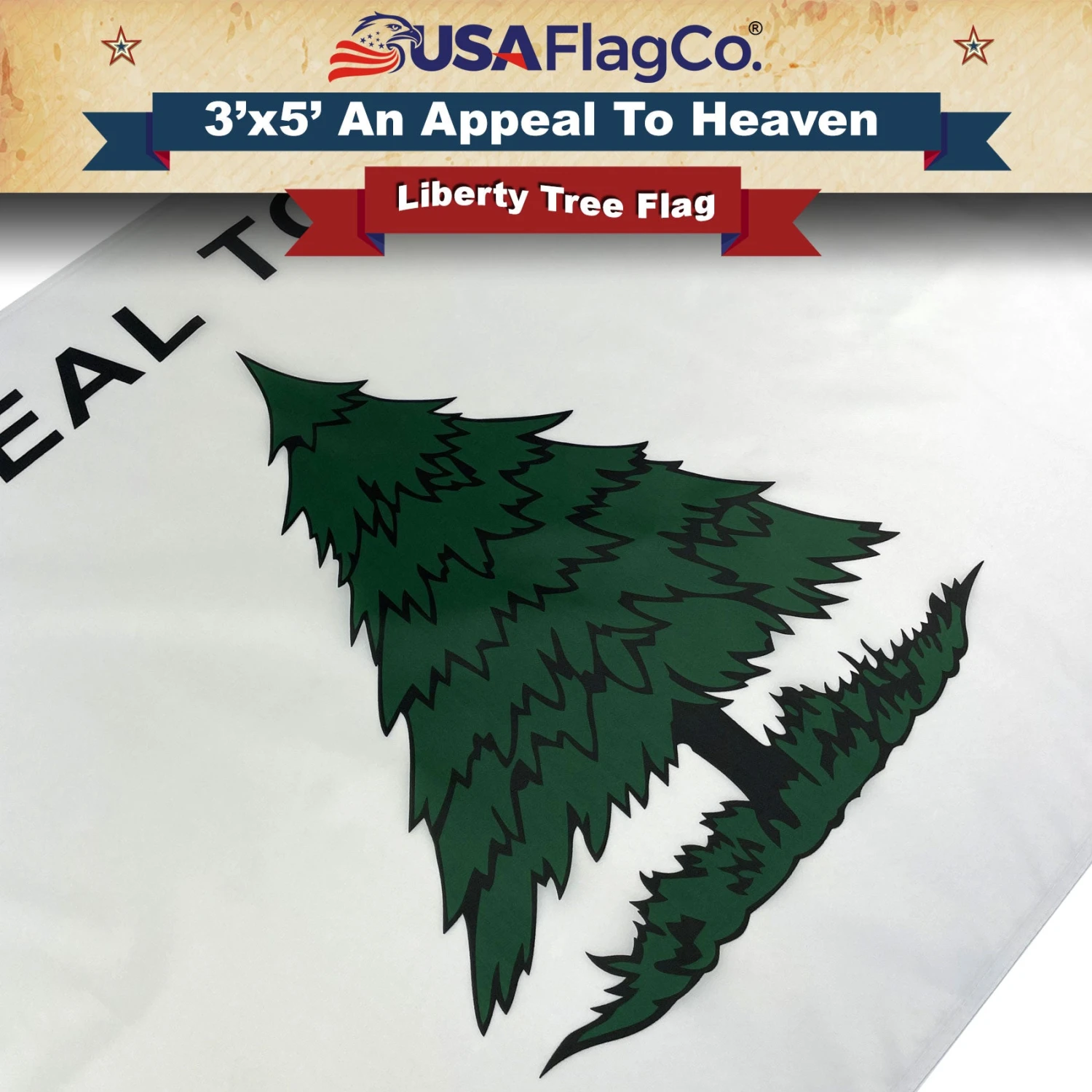 Design: A pine tree with the words “AN APPEAL TO HEAVEN” written in all capital letters above the tree, and a white field behind it.