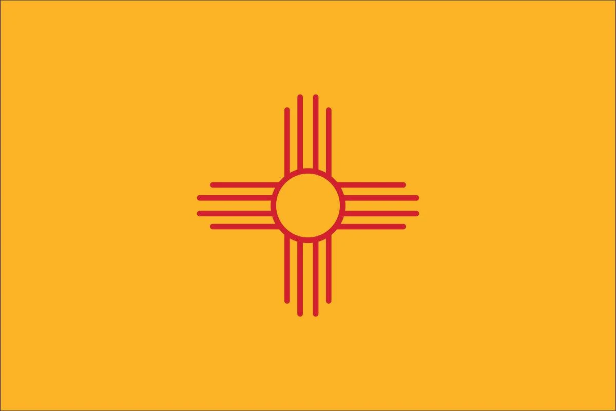 New Mexico Flag Design: The red and yellow of old Spain. The ancient Zia Sun symbol in red, in the center of a field of yellow.