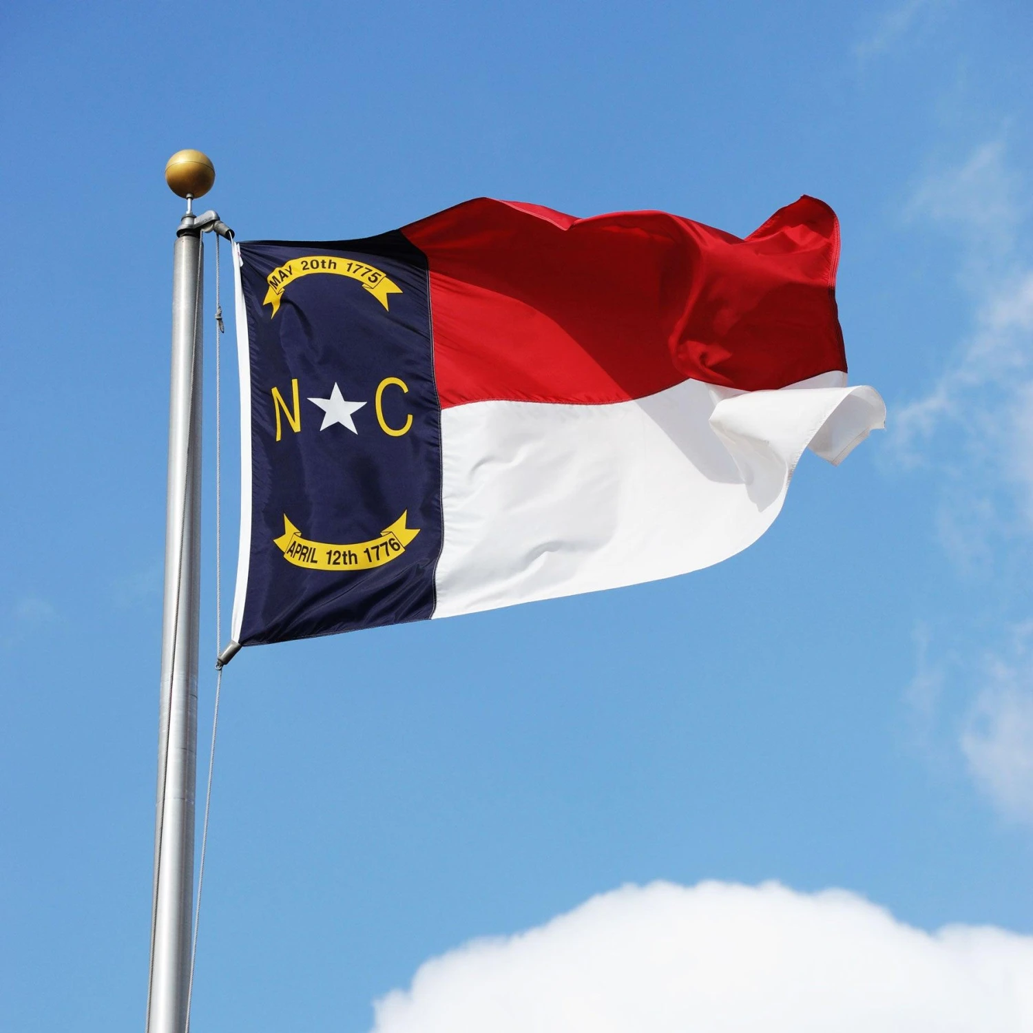 Our most popular and versatile outdoor North Carolina flag, USA Flag Co. flags offer the optimum combination of elegance and durability for every purpose. The 100% nylon material provides a rich, lustrous appearance. Our flags have superb wearing strength due to the materialās superior strength-to-weight ratio and will fly in the slightest breeze. State flags are finished with strong, polyester canvas headings and spurred brass grommets, and four needle fly hem. The result is a flag that will be flown with pride year after year.